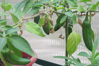 I’m not sure what kind of peppers these are.  They are actually a plant I bought last year, wrong time of year.  But I put it in the greenhouse and it has survived.  And now I have peppers.