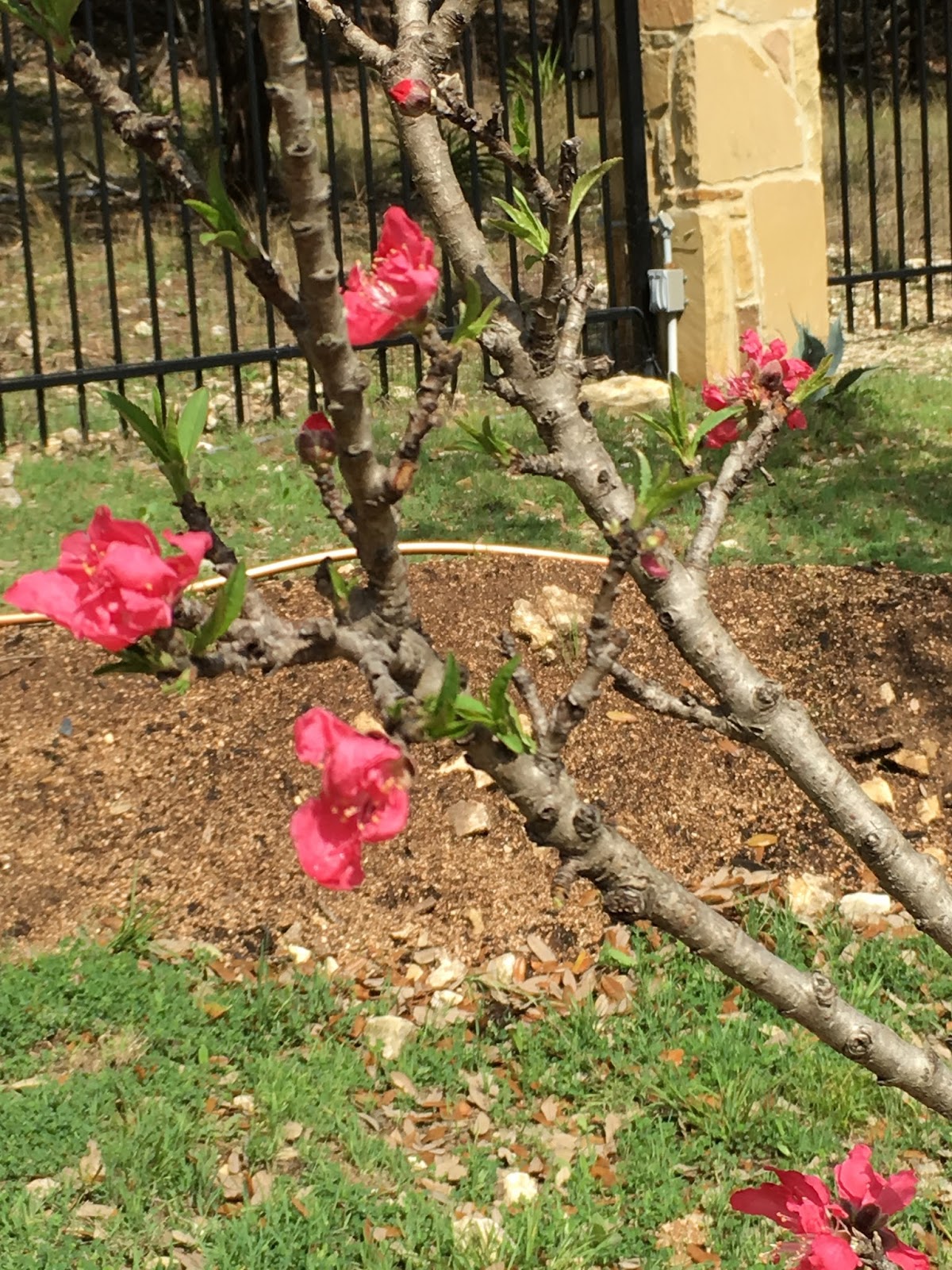 Another thing that has happened is the apple trees have fruit. We have lots of little apples on the trees. We transplanted the stupid plum (it needs a new name – maybe survivor?) to the area with the other fruit trees. Its short, but full of blossoms. The other plum also is getting its blossoms. The pear is starting to send out new shoots so blossoms are on the way. We may have to build a cage or something around the fruit trees to help us keep the fruit. Last year we lost fruit to the squirrels. I’d like to keep some fruit this year.